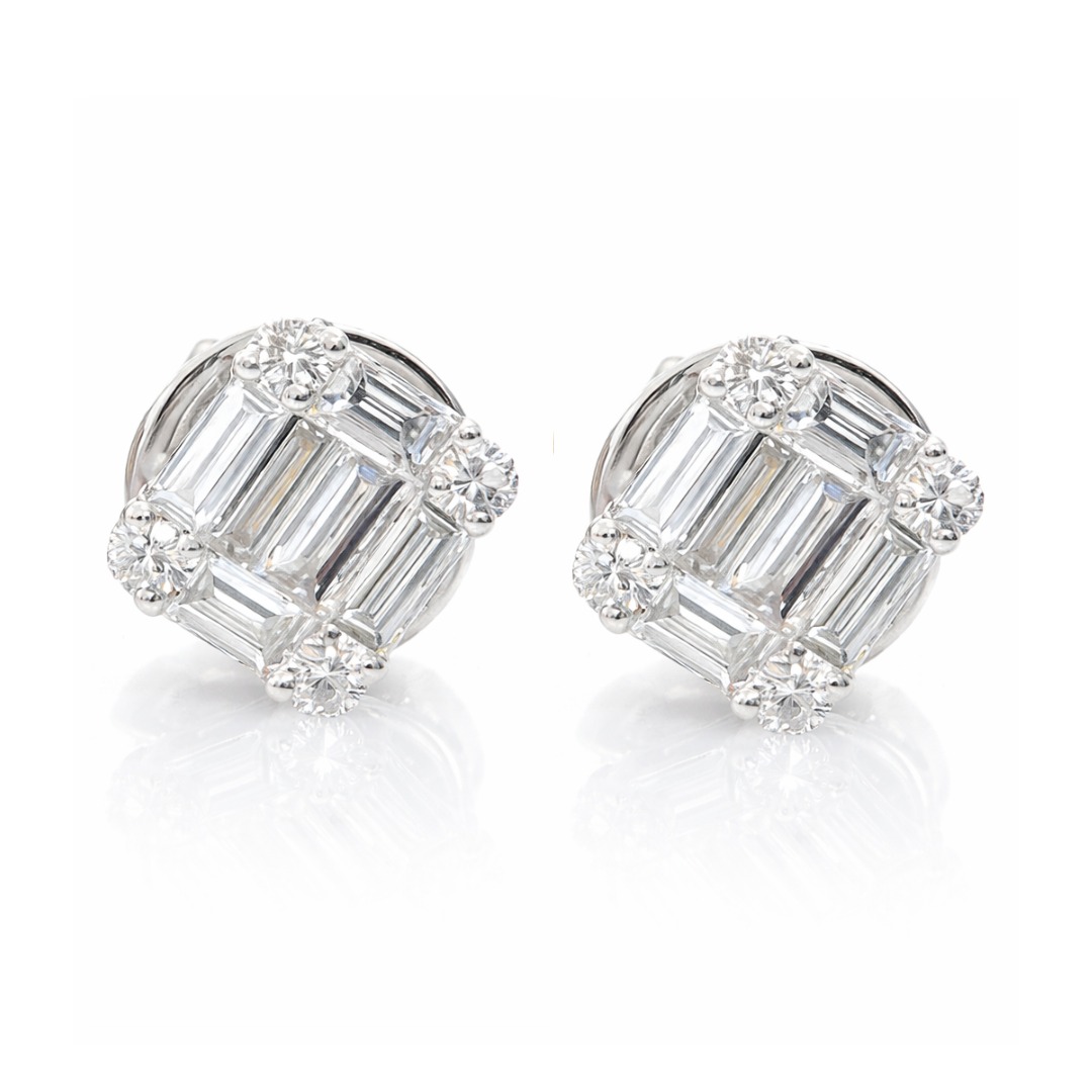 Baguette & Round Diamond Stud Earrings in White Gold
