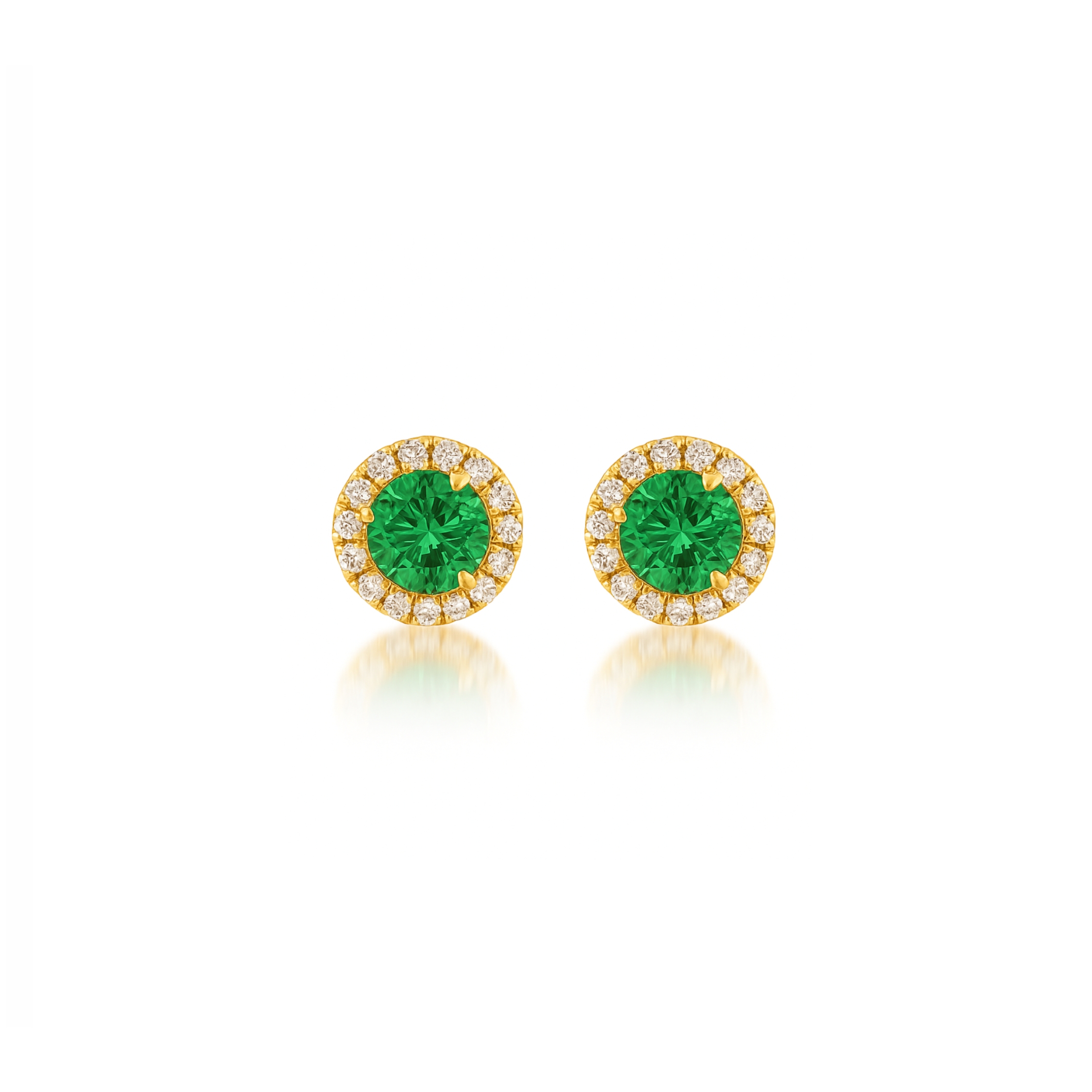 One pair of emerald and diamond stud earrings in 18k yellow gold, each earring set with one round cut emerald and sixteen round brilliant cut diamonds. Stamped HD 750.