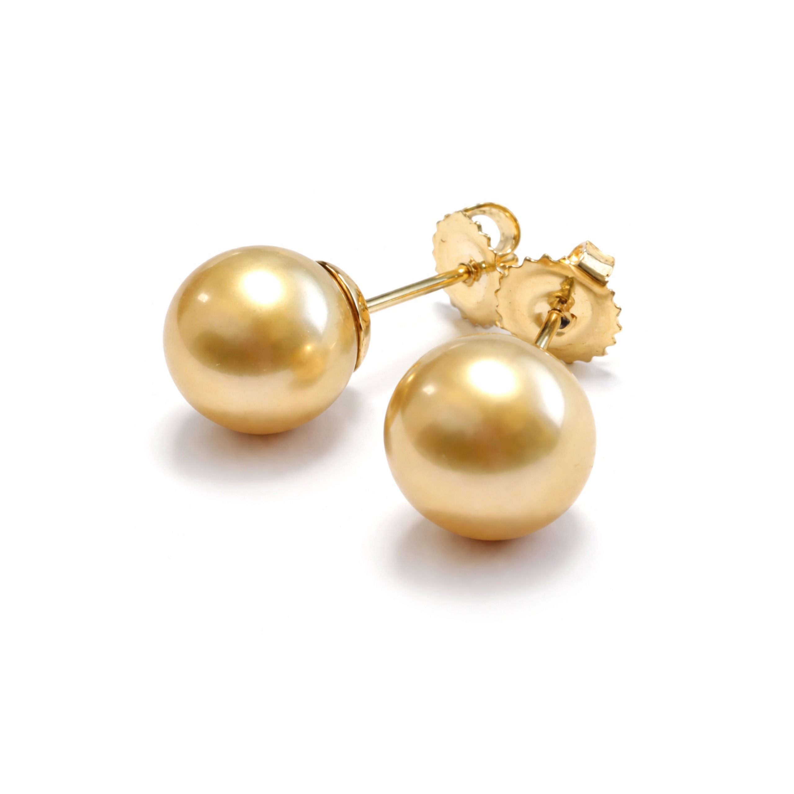 Elegant, luminous, and effortlessly timeless — these 10-10.5mm South Sea pearl stud earrings embody understated luxury. Set in 18k yellow gold, each earring features a round golden south sea pearl. Stamped 18k. Total weight: 4.0gms