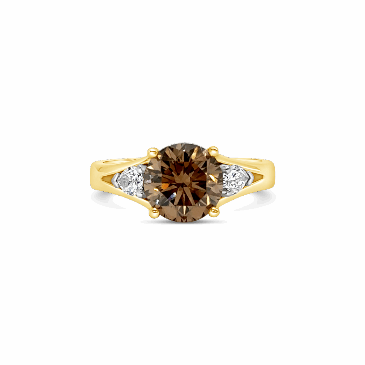 One three across Argyle champagne diamond ring in 18k yellow gold and platinum, featuring a round brilliant cut champagne diamond of 2.03ct, C5-C6 in colour and VVS1 in clarity, flanked by two pear cut diamonds totalling 0.27ct of E-F colour and VS2 clarity. Stamped HD 18K PLAT.