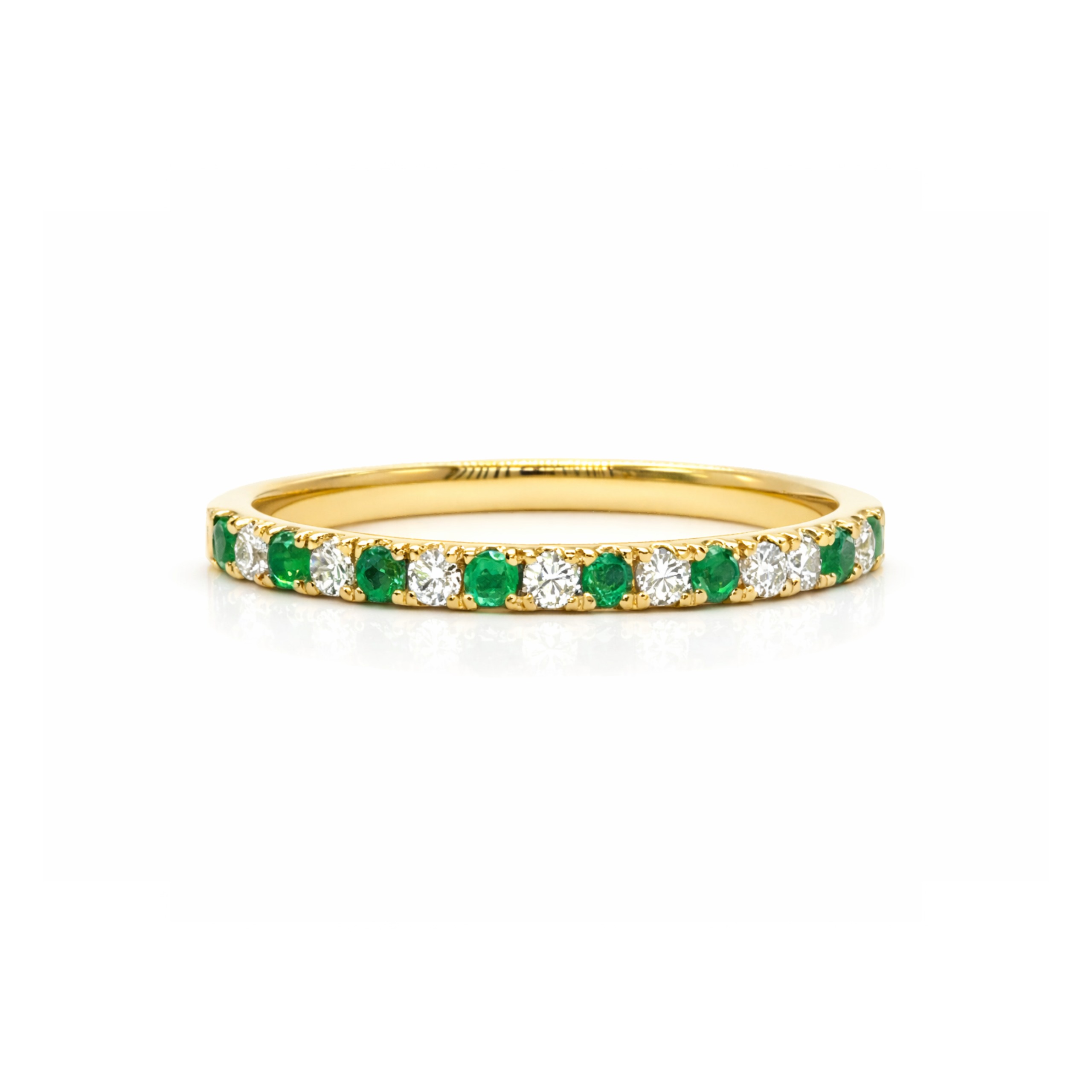 One diamond and emerald ring in 18k yellow gold comprising eight round cut emeralds totalling 0.16ct, alternating with seven round brilliant cut diamonds totalling 0.15ct, colour F-H, clarity VS-SI. Size L. Stamped HD 750. Total weight = 2.38 grams.