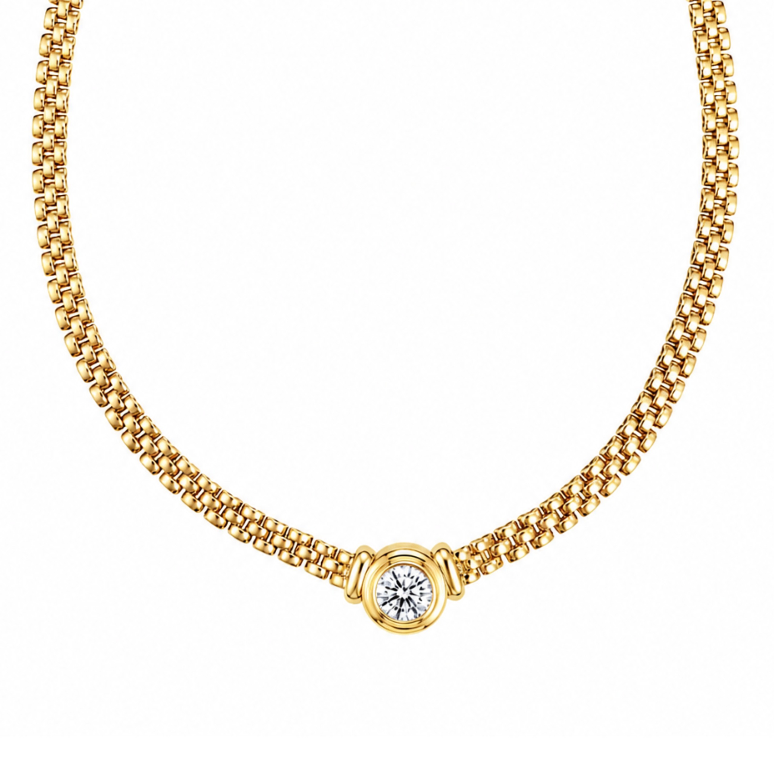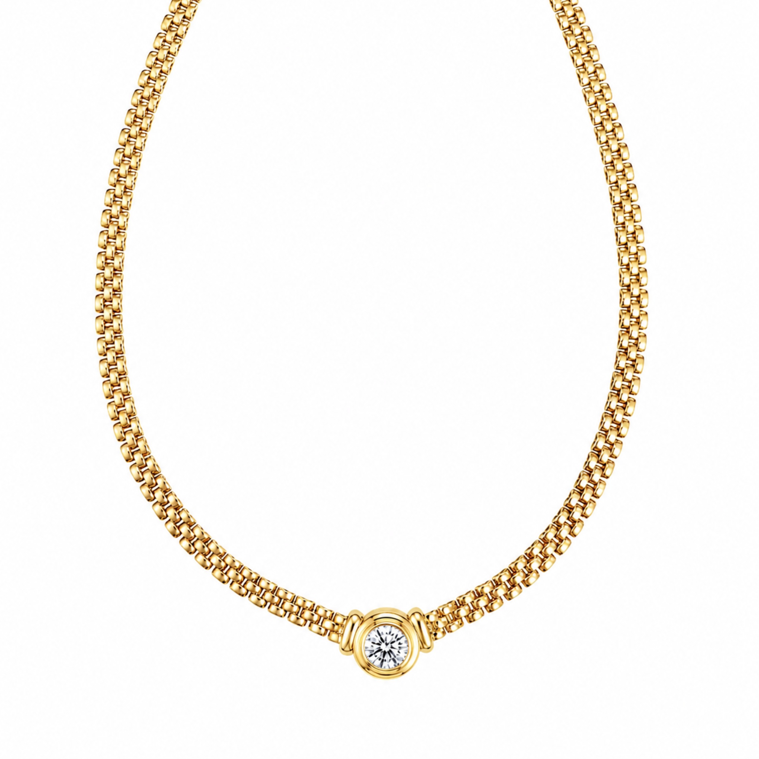 A three bar flat link necklace in 18k yellow gold featuring a bezel set round brilliant cut diamond of ideal cut, weighing 1.73ct. Stamped 50 HD 18K.